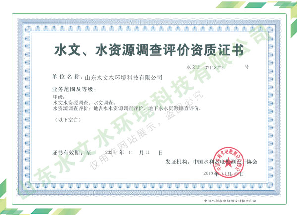 公司擁有水利工程設(shè)計(jì)、水土保持、水文水資源調(diào)查評(píng)價(jià)、水資源論證、建設(shè)項(xiàng)目環(huán)境影響評(píng)價(jià)、市政公用工程施工總承包、水利水電工程施工總承包、電子與智能化工程專業(yè)承包等資質(zhì),2017年通過質(zhì)量管理體系、環(huán)境管理體系、職業(yè)健康安全管理體系認(rèn)證;2020年被評(píng)為國家級(jí)高新技術(shù)企業(yè),同年被中國水利企業(yè)協(xié)會(huì)推薦為第一批“合同節(jié)水服務(wù)企業(yè)”;2021年被山東省、濟(jì)南市評(píng)為 “專精特新”中小企業(yè)。業(yè)務(wù)范圍涉及水利工程設(shè)計(jì);節(jié)水設(shè)計(jì)、改造、水平衡測(cè)試;山洪災(zāi)害調(diào)查;城市水資源調(diào)查評(píng)價(jià);建設(shè)項(xiàng)目水土保持方案編制、監(jiān)測(cè)、驗(yàn)收、水土保持規(guī)劃;水安全保障規(guī)劃、建設(shè)項(xiàng)目水資源論證、規(guī)劃水資源論證;建設(shè)項(xiàng)目環(huán)境影響評(píng)價(jià);入河排污口論證;防洪影響評(píng)價(jià);市政公用工程施工、水利水電工程施工、電子與智能化工程施工等。